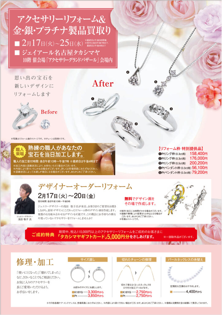 期間中、税込110,000円以上のアクセサリーリフォームをご成約のお客さまに「タカシマヤギフトカード」5,000円分をさしあげます。