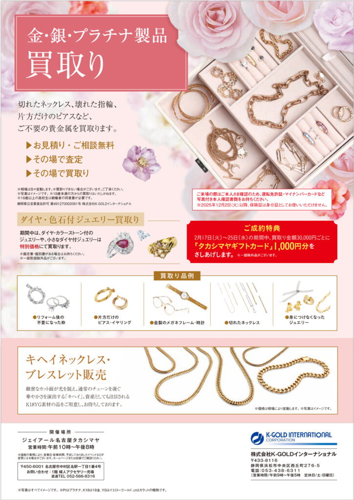 2月17日(火)~25日(水)の期間中、買取り金額30,000円ごとに「タカシマヤギフトカード」1,000円分をさしあげます。
