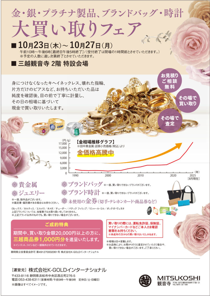 期間中、買い取り金額20,000円以上の方に、三越商品券1,000円分を進呈いたします。