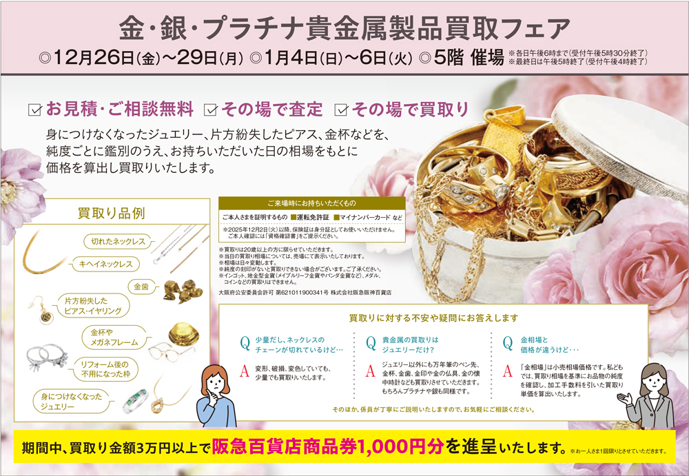 期間中、買取り金額3万円以上で、阪急百貨店商品券1,000円分を進呈いたします。
