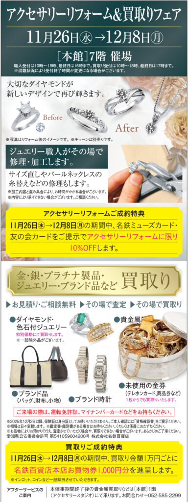買取りご成約特典:期間中、買取り金額1万円ごとに名鉄百貨店本店お買物券1,000円分を進呈いたします。