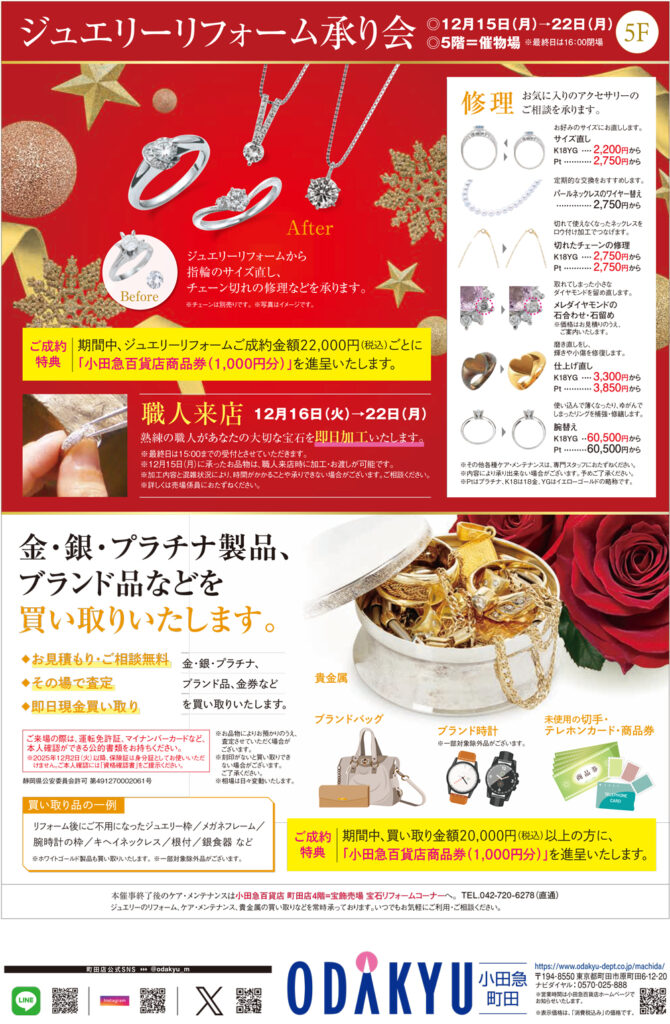期間中、ジュエリーリフォーム買い取り金額22,000円(税込)以上の方に、「小田急百貨店商品券(1,000円分)」を進呈いたします。