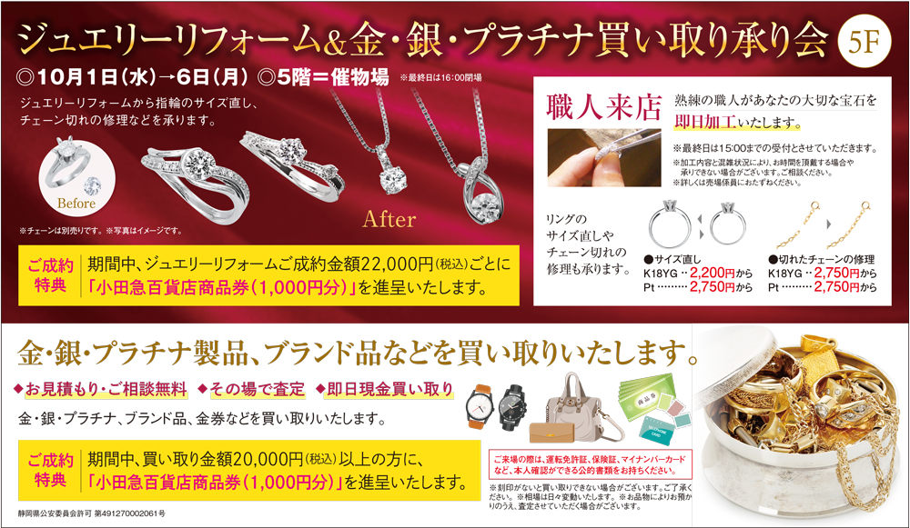 期間中、ジュエリーリフォームご成約金額22,000円(税込)ごとに、「小田急百貨店商品券(1,000円分)」を進呈いたします。